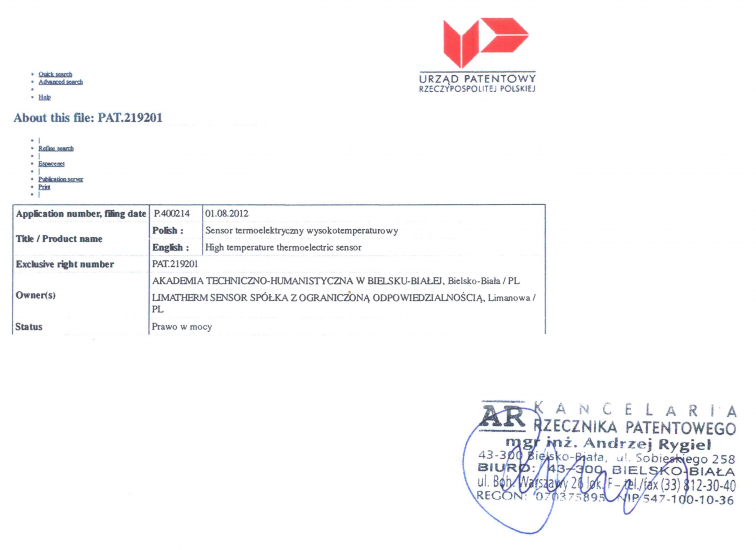 Z nieukrywaną satysfakcją informujemy, że firma Limatherm Sensor jako pierwsza w Polsce otrzymała patent na wysokotemperaturowy termoelektryczny czujnik temperatury. Limatherm Sensor przy współpracy z Akademią Techniczno-Humanistyczną w Bielsku-Białej zaprojektowała i wykonała nowatorską konstrukcję czujnika wykazującą odporność pomiarową na temperaturę do 2300°C. Konstrukcja czujnika oparta jest o termoelement wolframowo-renowy z zastosowaniem osłony molibdenowej, będzie on prezentowany na stoisku Limatherm Sensor przy najbliższej edycji targów Automaticon 2015.