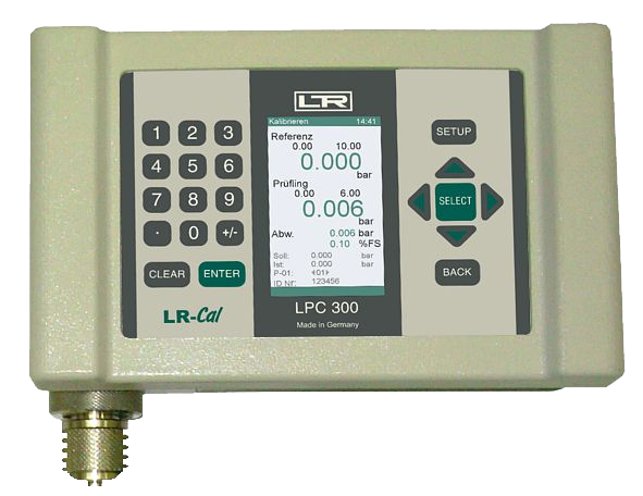 Kalibrator ciśnienia LPC300 pozwala na pomiar ciśnienia w szerokim zakresie od 0,25 do 800bar, wykorzystując szeroką gammę wymiennych przetworników ciśnienia. Przetwornik ciśnienia może być zamontowany na kalibratorze lub poza nim za pomocą przewodu o długości 1,2m. W przypadku wymiany przetwornika ciśnienia na inny tryb , kalibrator automatycznie rozpoznaje nowy zakres pomiarowy, bez konieczności ręcznej konfiguracji. Kalibrator posiada trzy tryby pracy: pomiar/kalibracja i test presostatów ciśnienia. Dane z kalibracji mogą być dokumentowane na PC, za pomocą oprogramowania (opcja).