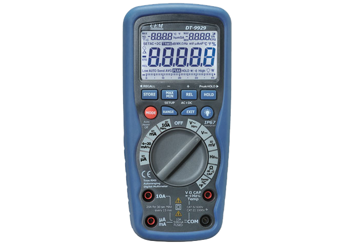 DT-9929/9939 to profesjonalny multimetr oferujący szeroki zakres funkcji pomiarowych. Urządzenie zamknięte jest w bardzo wytrzymałej i wodoszczelnej obudowie IP67 (z gumowymi elementami) charakteryzującej się dużą odpornością na uszkodzenia mechaniczne.